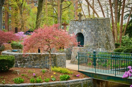 The grotto and garden fell into disrepair for forty years and were eventually deeded by the property developer who owned the building to the St. Joseph Catholic Church only a block away. The grotto has been beautifully restored and was re-dedicated in 2003. Today the grotto and gardens are maintained by church volunteers.