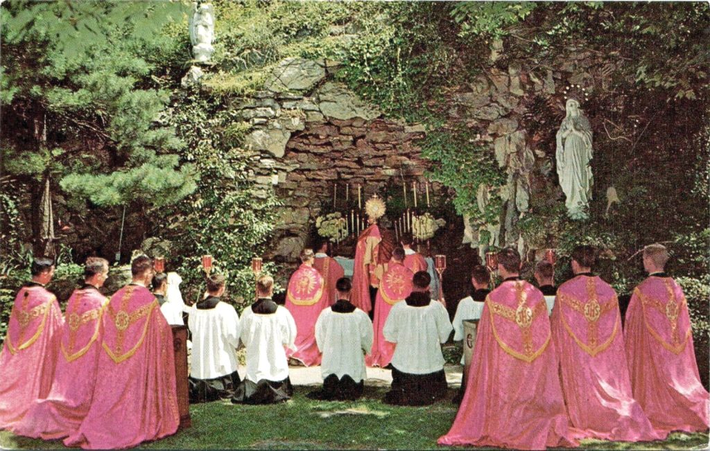 The beautiful grotto at the former Don Bosco College, a Salesian Seminary in Newton, New Jersey, was dedicated in 1938 and was featured on a number of postcards. The college is now the Sussex County Community College campus; it’s possible this grotto still exists (although without its lovely statues).