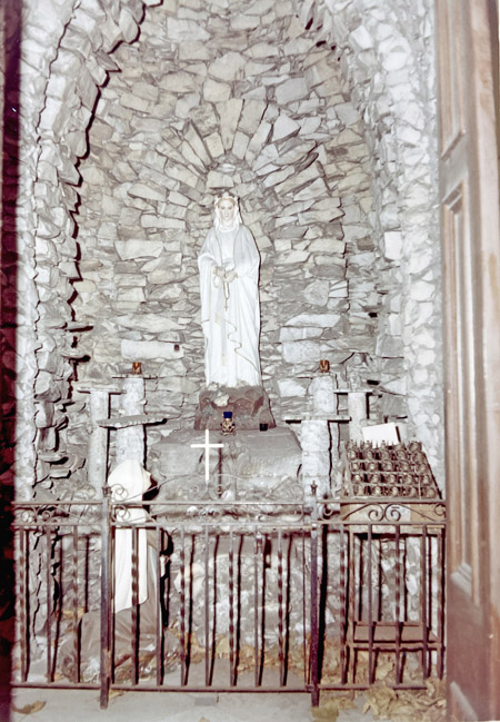 What makes the church absolutely unique in this country is its Grotto of Lourdes, which stands to the right of the main altar and is by far the most prominent and interesting feature of the church. This grotto is unlike anything to be seen in other Catholic churches…. It is a perfect imitation of the famous grotto of “Our Lady of Lourdes” in France… built in an alcove a few feet back from the altar rail. The base is formed of large, unhewn stones, taken from the surrounding hills. Small stones are used at the top. A painted figure of the Virgin, molded in exquisite taste, is placed among the rocks.