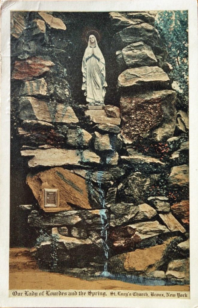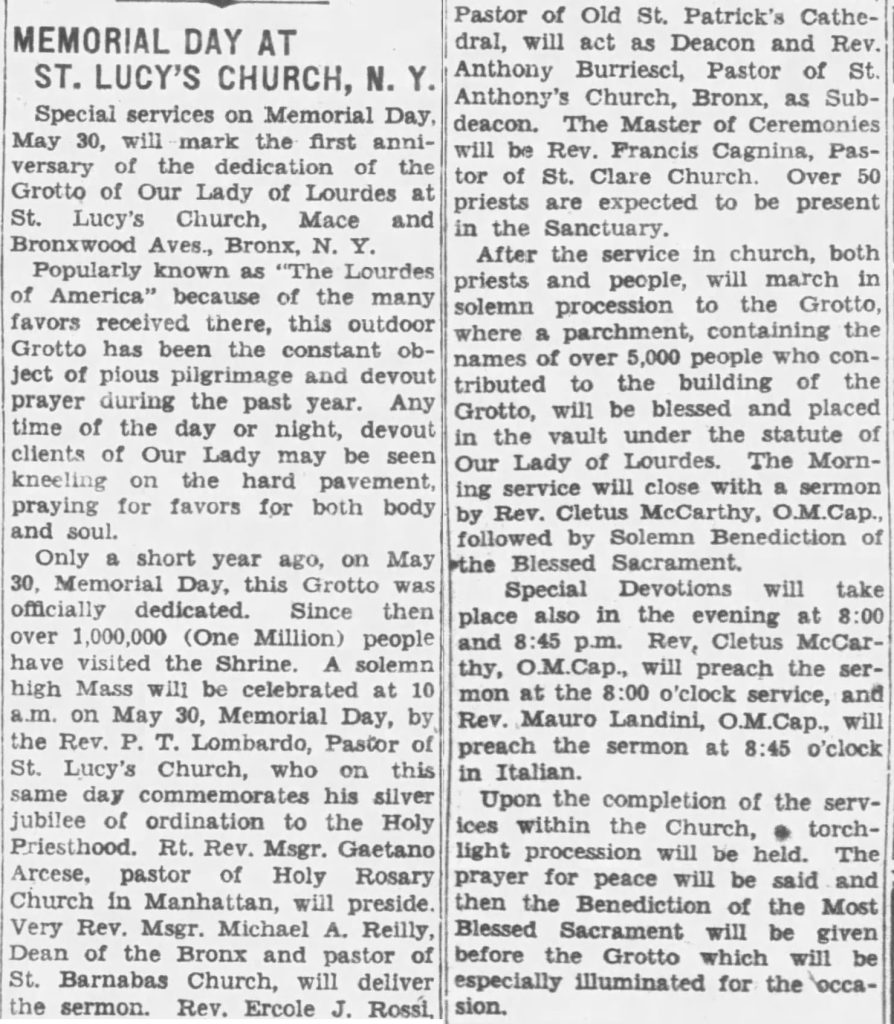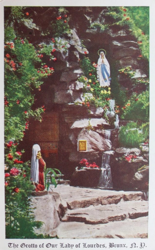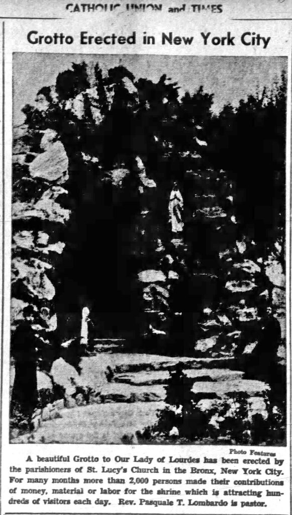 The newspaper article about the new grotto, above, states that more than 2,000 persons contributed money, materials or labor for the shrine. According to the church website, “The stones for the grotto were hand-cut by an Italian craftsman named Gino Brandolini. He immigrated from Italy and his family lived for three generations in the Bronx…. Msgr Lombardo hoped it would provide parishioners and outside visitors the possibility of experiencing the intimate and spiritual nature of the Lourdes grotto without making a transatlantic pilgrimage…. Our Lady of Lourdes Grotto is comprised of field stones stacked together forming a 30 foot high cave.”