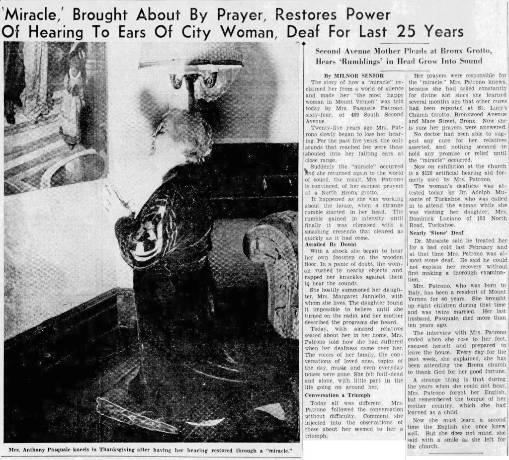 Then four months later, a Mrs. Pasquale Patrono of Mount Vernon, NY, who had progressively lost her hearing over the previous 25 years, heard about that and other healings at the grotto. Over several months in 1939, she visited it numerous times and “asked constantly for divine aid,” and her petitions were granted: her hearing was suddenly and inexplicably restored.