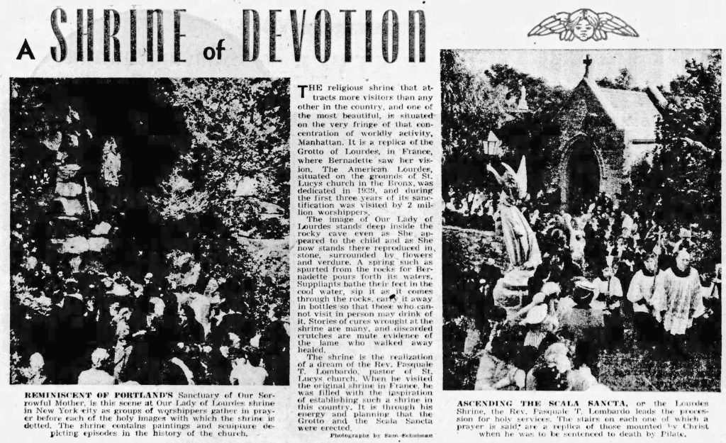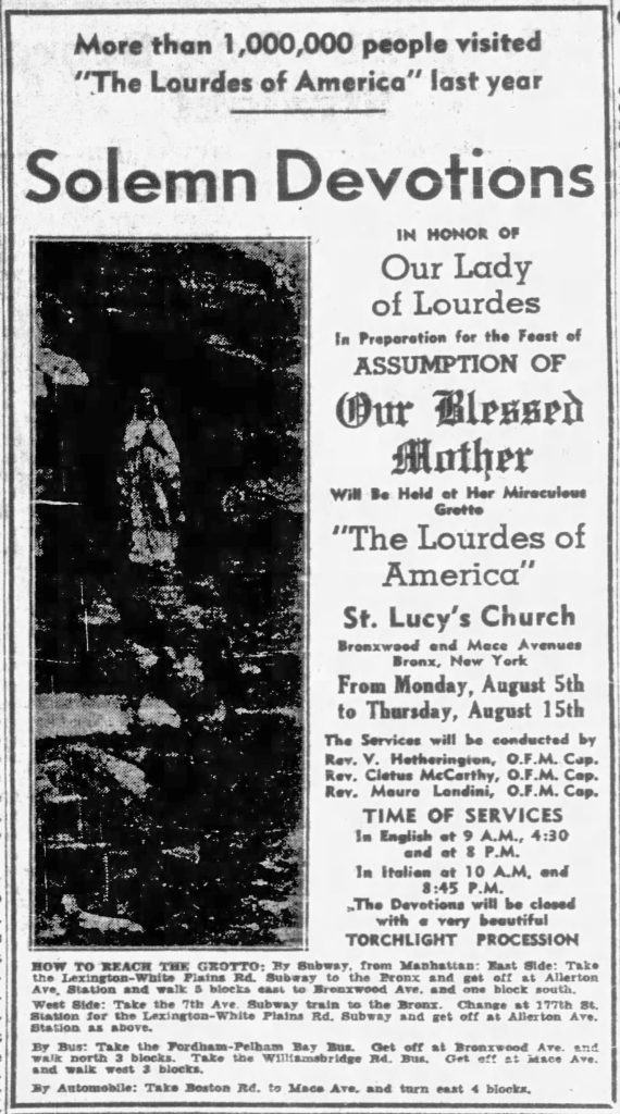 Rev. Lombardo held devotional events at the grotto a number of times each year: for Mother’s Day, the Feast of St. Anthony (an Italian Catholic feast day), Feast of the Assumption, the anniversaries of the dedication of the grotto, etc., and advertised these locally.