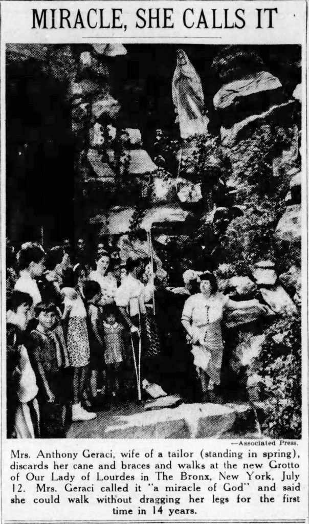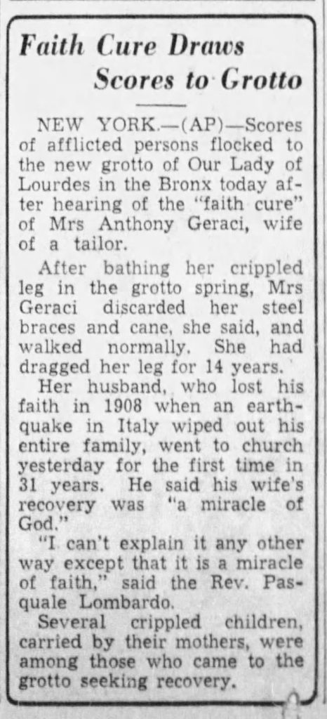 Within a few months of the dedication, at least two miraculous healings were reported in news articles: On July 11, 1939, a Mrs. Anthony Geraci, whose foot had been crippled for 14 years, was able to walk after bathing her foot in the grotto’s water: