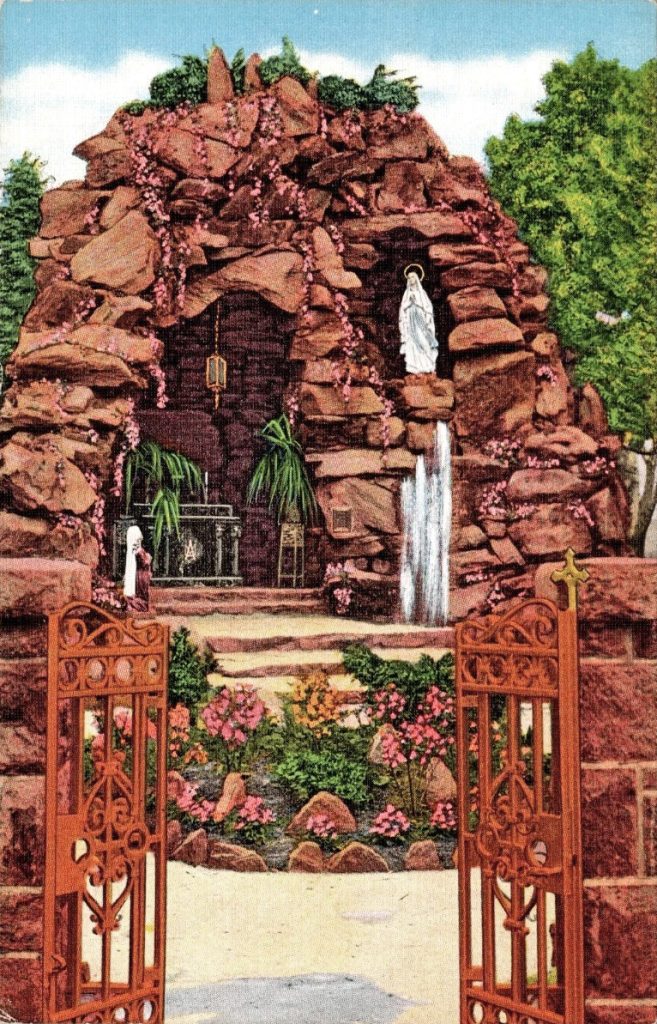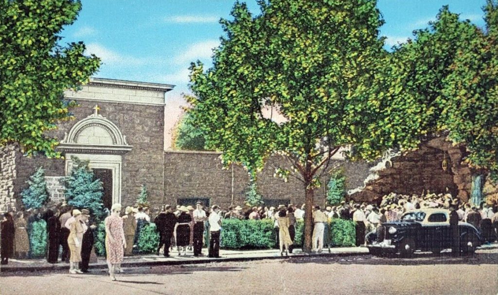 After that, word spread like wildfire and the grotto was deluged with tens of thousands of visitors. Newspapers of 1940 (see below) stated that “More than 1,000,000 people visited the ‘Lourdes of America’ Last Year.” Information on the backs of postcards published around 1940 state that “It is estimated that more than 25,000 people visit this wonderful shrine every week.”