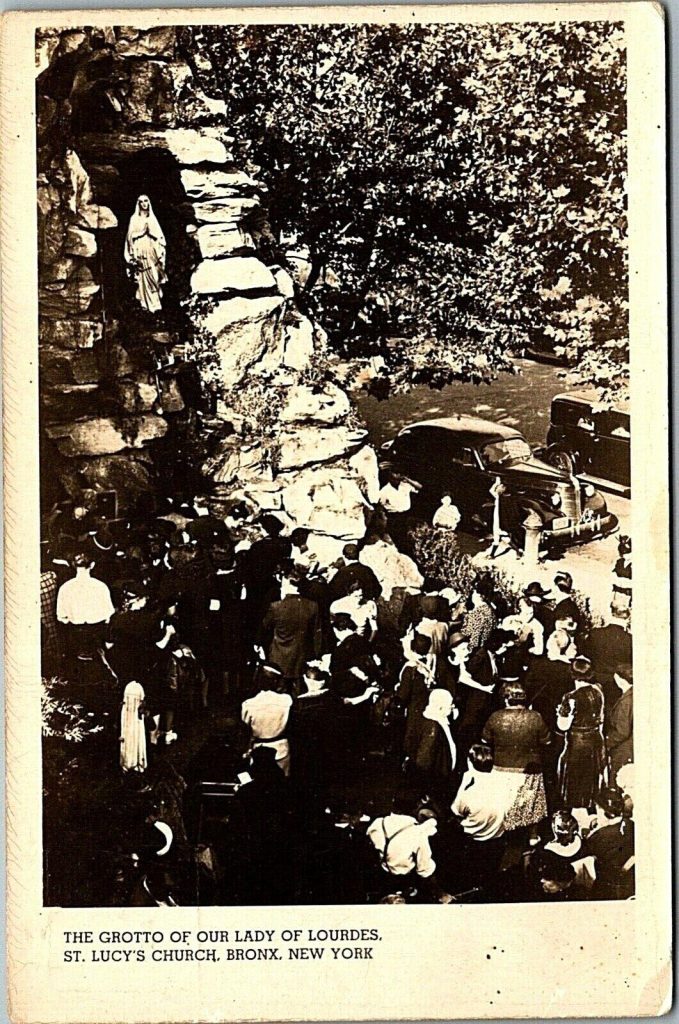 Msgr. Lombardo had travelled to Lourdes, France and been so impressed with the original Grotto, that even before his church had been built, he evidently planned to build a grotto next to it, to be named “The Lourdes of America” (despite the 1,000+ other Lourdes grottos already built here–perhaps a bit of Bronx-Italian swagger, or just NYCers’ unawareness of anything west of them). His plans are evident from an early postcard (below left) depicting a planned design for a two-story classical Italian Romanesque church with a four-story bell tower. Only one story, no tower was actually completed.