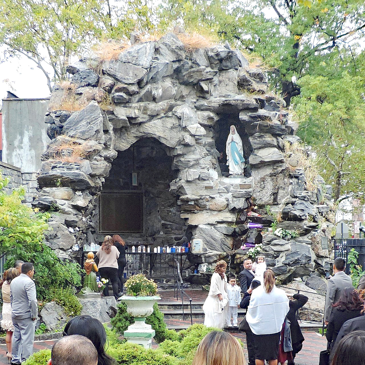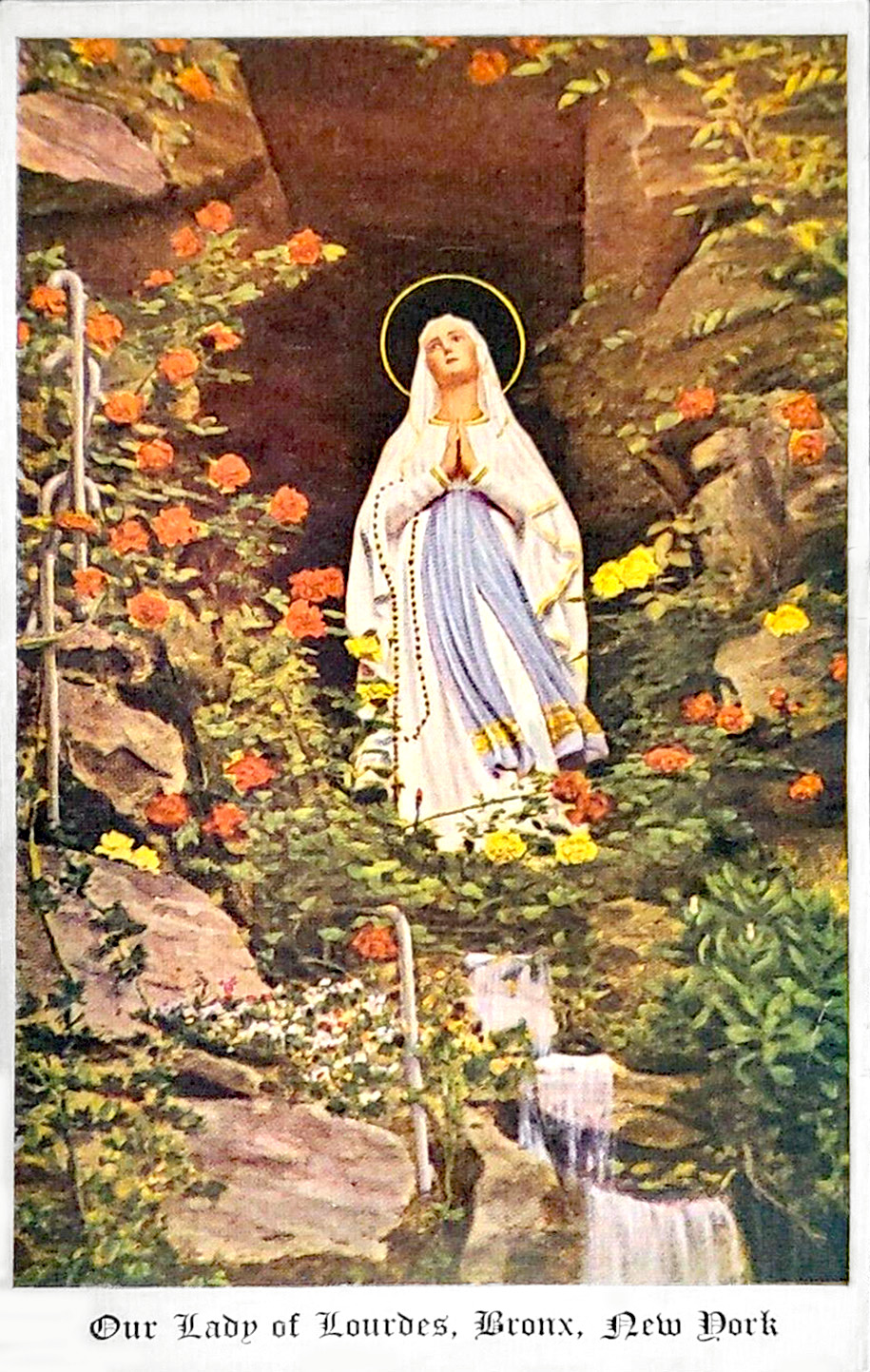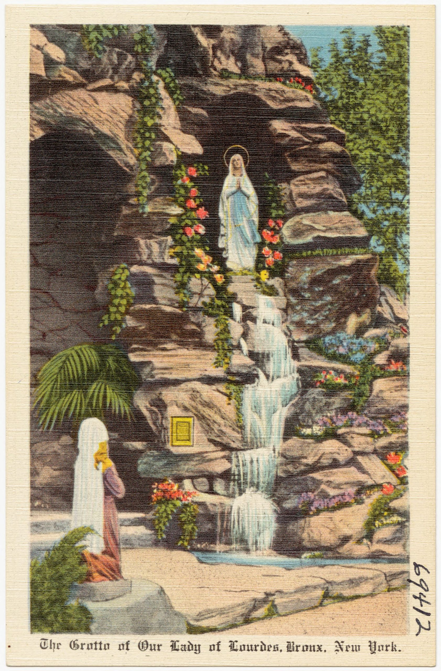 The newspaper article about the new grotto, above, states that more than 2,000 persons contributed money, materials or labor for the shrine. According to the church website, “The stones for the grotto were hand-cut by an Italian craftsman named Gino Brandolini. He immigrated from Italy and his family lived for three generations in the Bronx…. Msgr Lombardo hoped it would provide parishioners and outside visitors the possibility of experiencing the intimate and spiritual nature of the Lourdes grotto without making a transatlantic pilgrimage…. Our Lady of Lourdes Grotto is comprised of field stones stacked together forming a 30 foot high cave.”