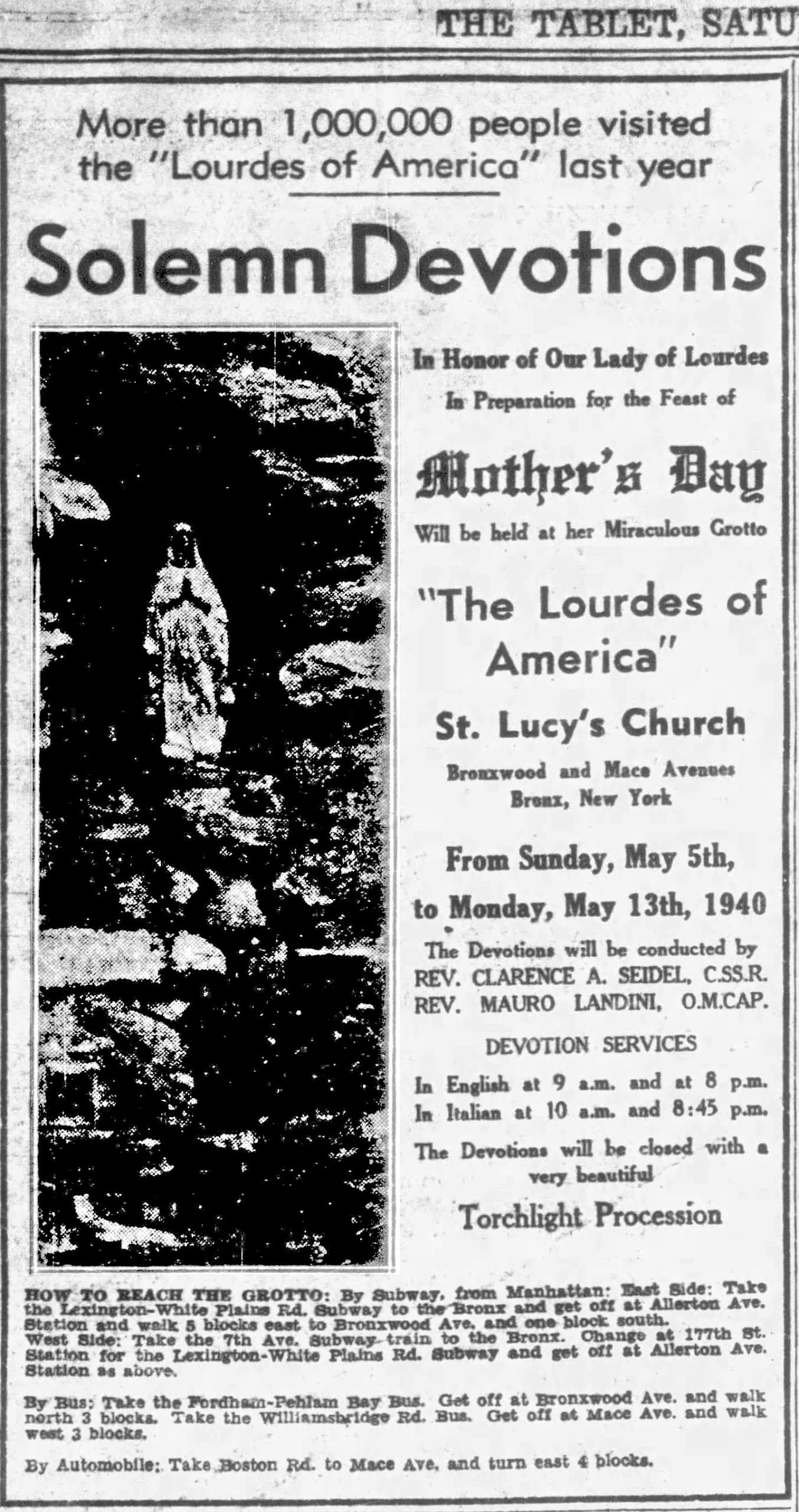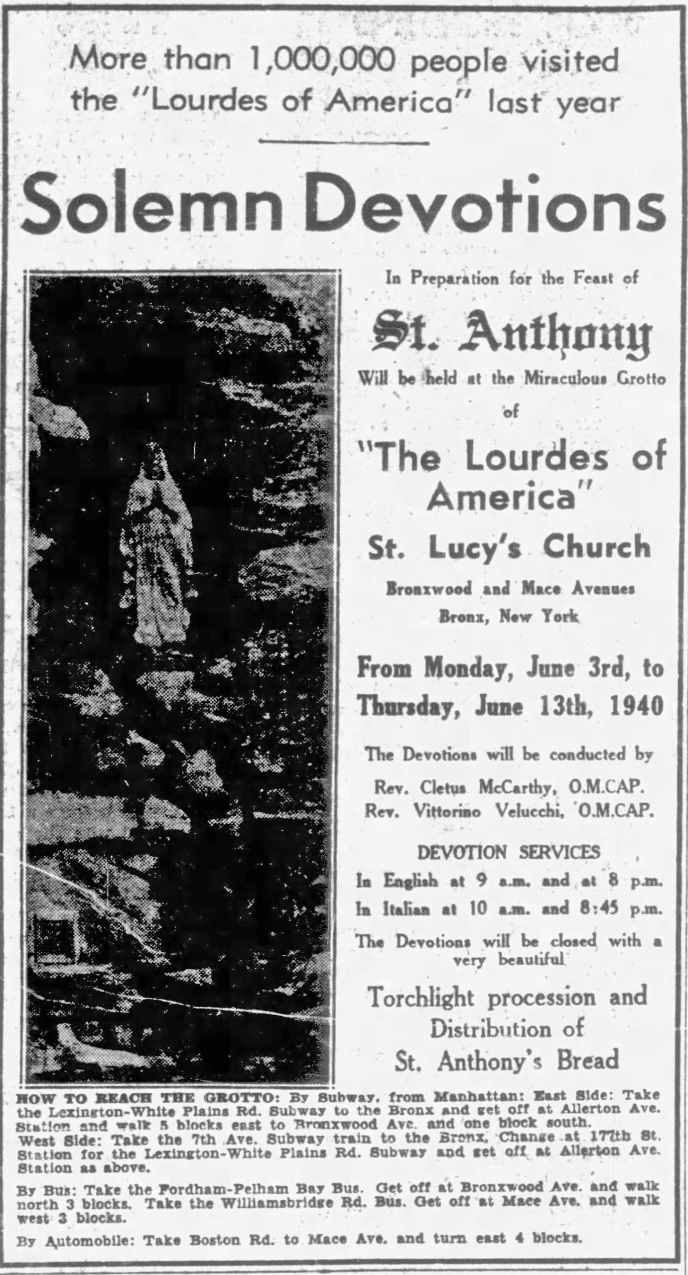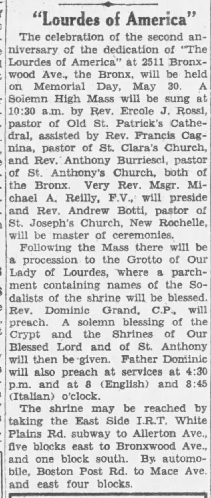 Rev. Lombardo held devotional events at the grotto a number of times each year: for Mother’s Day, the Feast of St. Anthony (an Italian Catholic feast day), Feast of the Assumption, the anniversaries of the dedication of the grotto, etc., and advertised these locally.