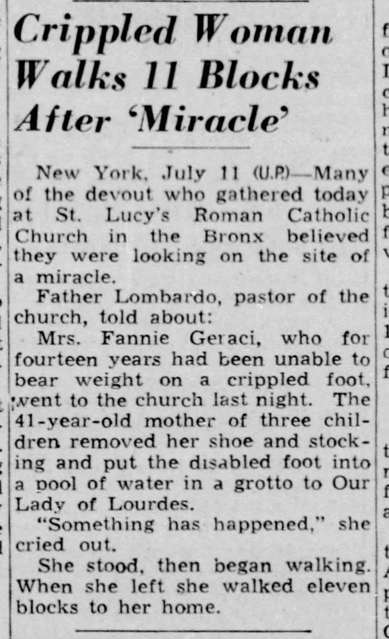 Within a few months of the dedication, at least two miraculous healings were reported in news articles: On July 11, 1939, a Mrs. Anthony Geraci, whose foot had been crippled for 14 years, was able to walk after bathing her foot in the grotto’s water: