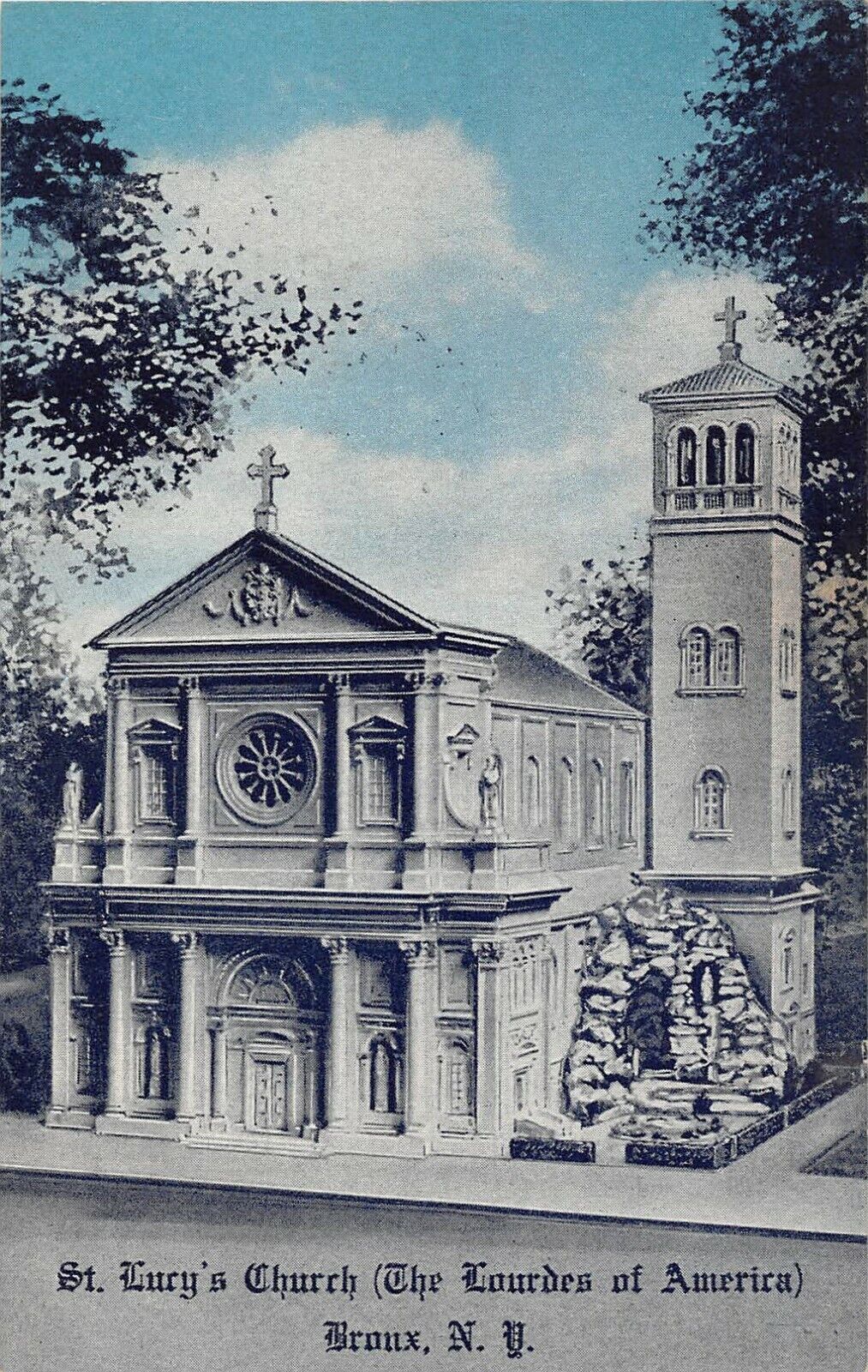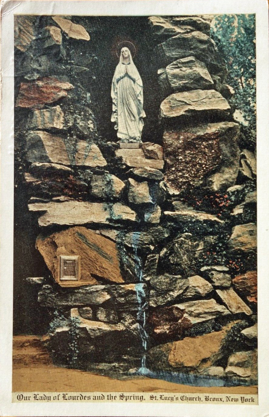 Msgr. Lombardo had travelled to Lourdes, France and been so impressed with the original Grotto, that even before his church had been built, he evidently planned to build a grotto next to it, to be named “The Lourdes of America” (despite the 1,000+ other Lourdes grottos already built here–perhaps a bit of Bronx-Italian swagger, or just NYCers’ unawareness of anything west of them). His plans are evident from an early postcard (below left) depicting a planned design for a two-story classical Italian Romanesque church with a four-story bell tower. Only one story, no tower was actually completed.