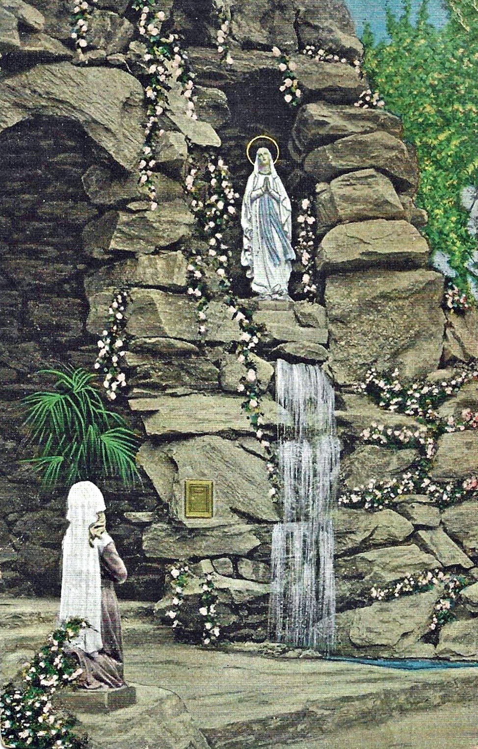 The grotto has water flowing into a small pool. According to a later news article, the water originally came from a small natural spring nearby, although it was eventually supplied by municipal water.